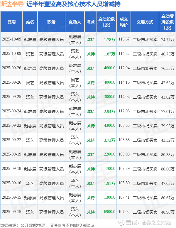 证券之星消息,根据10月10日市场公开信息、上市公司公告及交易所披露数据整理,斯达半导(603290)最新董监高及相关人员股份变动情况:2025年10月9日公司高级管理人员戴志展、高级管理人员汤艺共减持公司股份3.65万股,占公司总股本为0.0152%。变动期间公司股价上涨5.27%,10月9日当日收盘报115.8元。