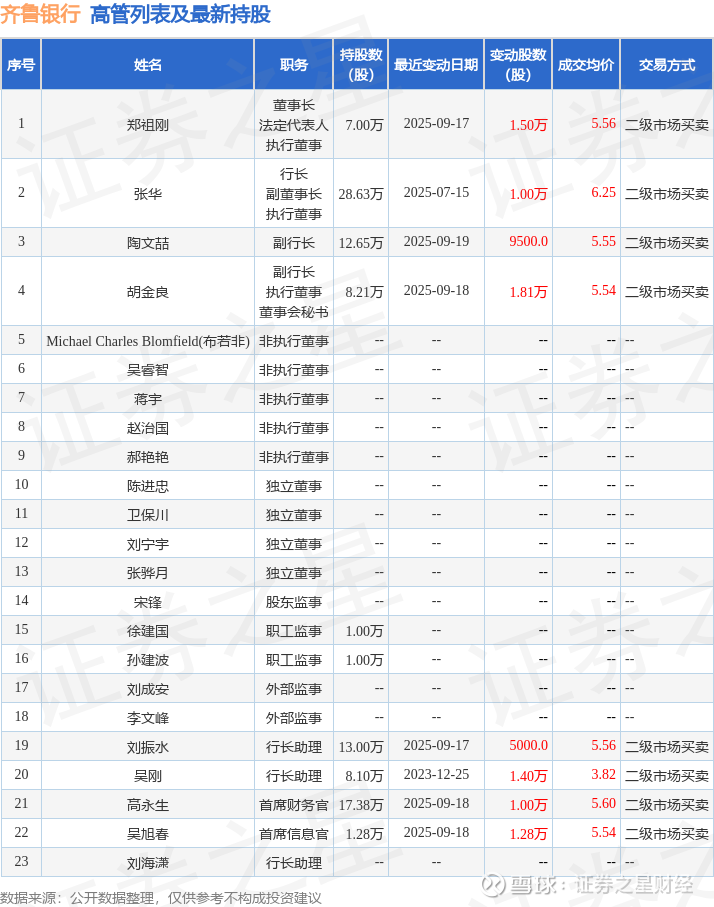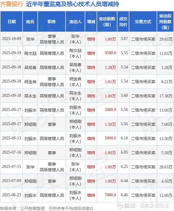 齐鲁银行近半年内的董监高及核心技术人员增减持详情如下: