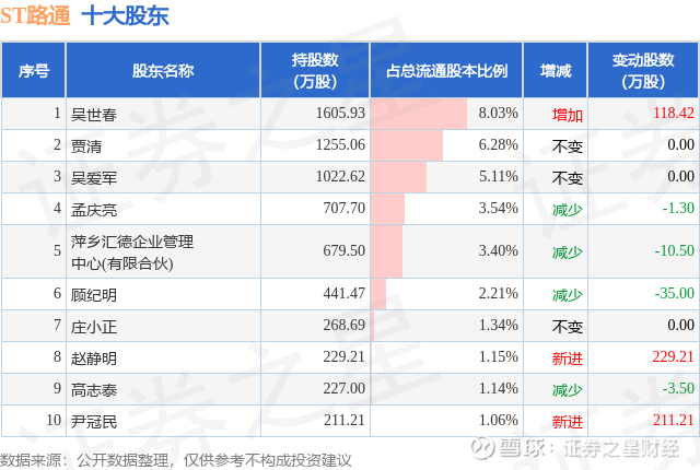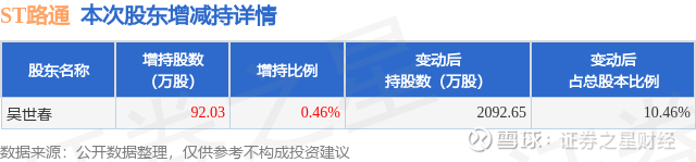 证券之星消息,10月10日ST路通发布公告《ST路通:无锡路通视信网络股份有限公司关于持股5%以上股东增持计划期限届满暨实施完成的公告》,其股东吴世春于2025年7月8日至2025年10月10日间合计增持92.03万股,占公司目前总股本的0.4602%,变动期间该股股价下跌1.6%,截止10月10日收盘报10.45元。