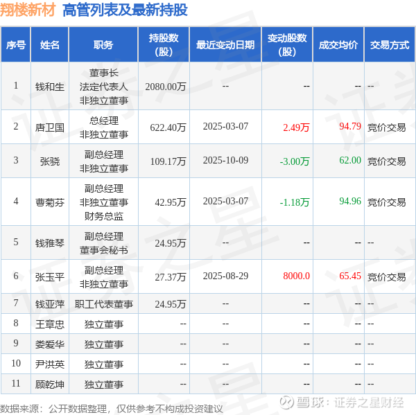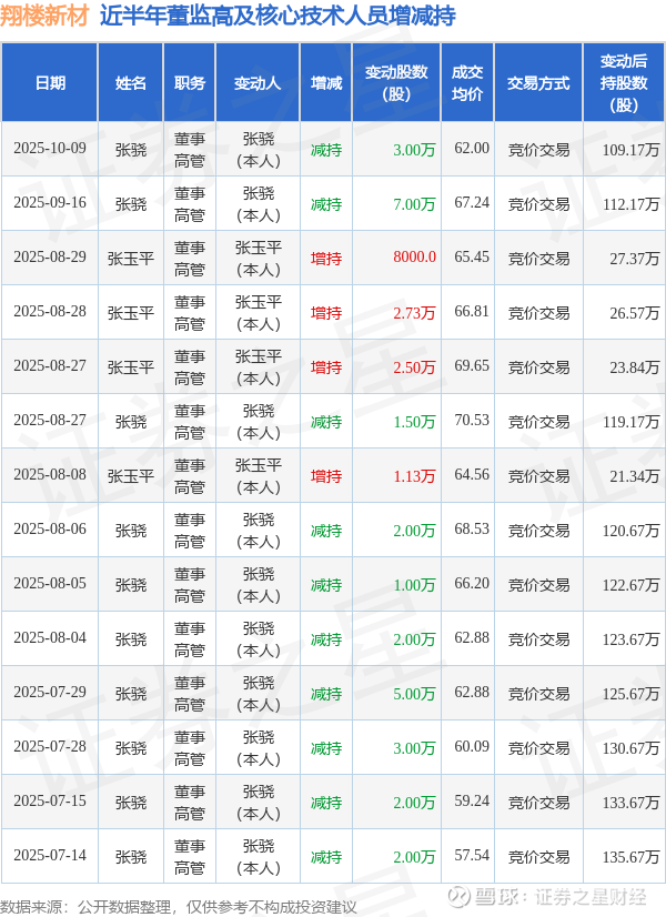翔楼新材近半年内的董监高及核心技术人员增减持详情如下: