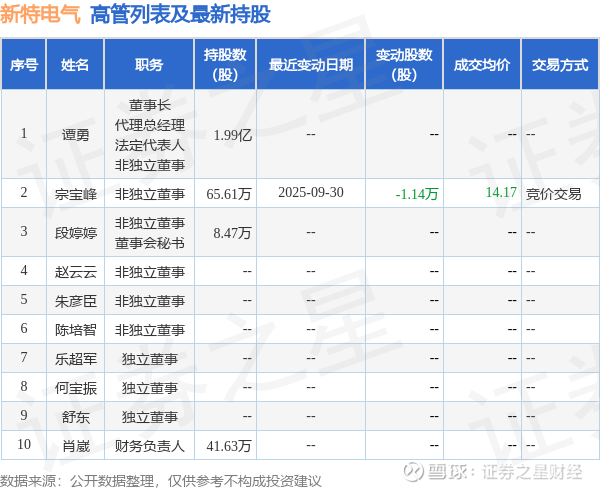 新特电气的高管列表及最新持股情况如下: