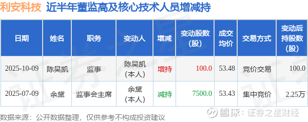 证券之星消息,根据10月10日市场公开信息、上市公司公告及交易所披露数据整理,利安科技(300784)最新董监高及相关人员股份变动情况:2025年10月9日公司监事陈吴凯共增持公司股份100.0股,占公司总股本为0.0002%。变动期间公司股价下跌0.21%,10月9日当日收盘报53.43元。