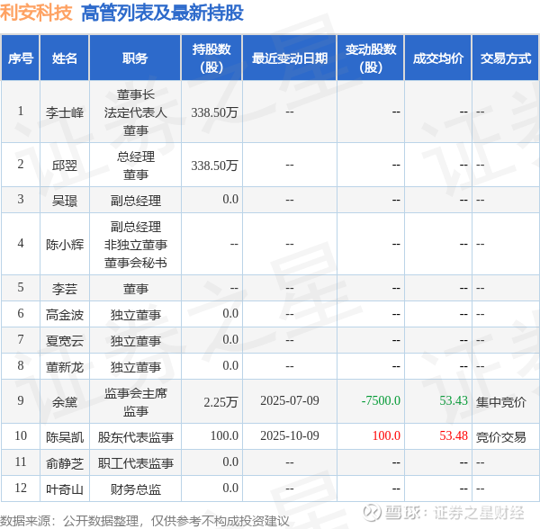 利安科技近半年内的董监高及核心技术人员增减持详情如下: