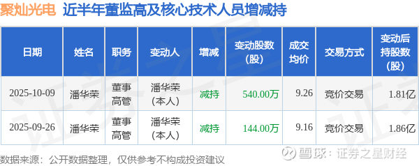 证券之星消息,根据10月10日市场公开信息、上市公司公告及交易所披露数据整理,聚灿光电(300708)最新董监高及相关人员股份变动情况:2025年10月9日公司董事,高管潘华荣共减持公司股份540.0万股,占公司总股本为0.5751%。变动期间公司股价上涨3.45%,10月9日当日收盘报9.3元。