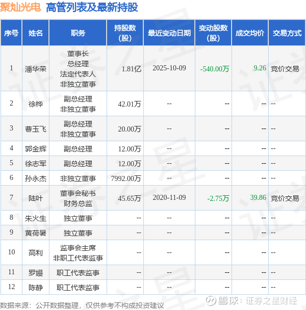 聚灿光电近半年内的董监高及核心技术人员增减持详情如下: