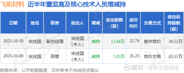 证券之星消息,根据10月10日市场公开信息、上市公司公告及交易所披露数据整理,飞凯材料(300398)最新董监高及相关人员股份变动情况:2025年10月9日公司高管宋述国共减持公司股份7.83万股,占公司总股本为0.0138%。变动期间公司股价下跌1.55%,10月9日当日收盘报25.98元。