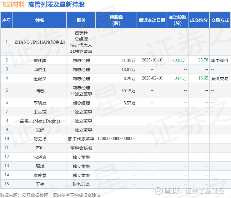 飞凯材料近半年内的董监高及核心技术人员增减持详情如下: