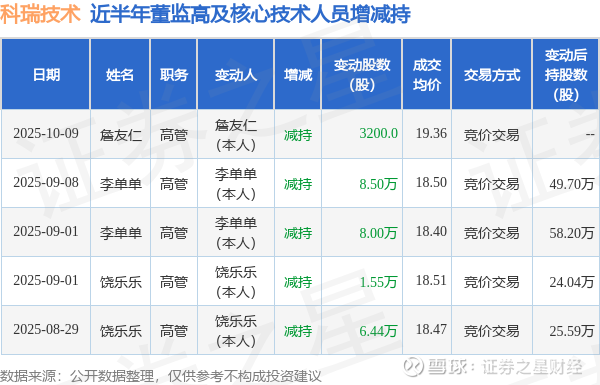 科瑞技术近半年内的董监高及核心技术人员增减持详情如下: