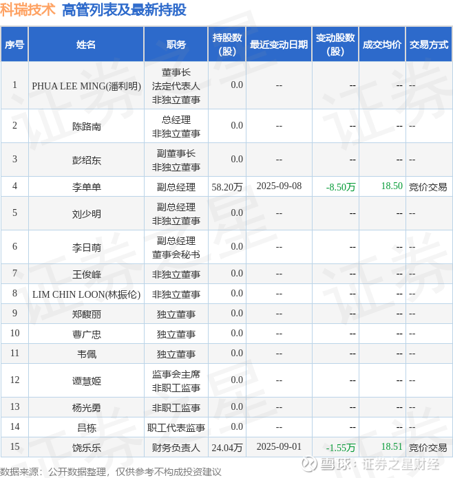 科瑞技术的高管列表及最新持股情况如下: