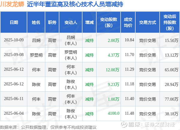 川发龙蟒近半年内的董监高及核心技术人员增减持详情如下: