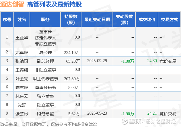 证券之星消息,根据10月10日市场公开信息、上市公司公告及交易所披露数据整理,通达创智(001368)最新董监高及相关人员股份变动情况:2025年10月9日公司高管张靖国共减持公司股份1.48万股,占公司总股本为0.013%。变动期间公司股价上涨1.29%,10月9日当日收盘报24.32元。