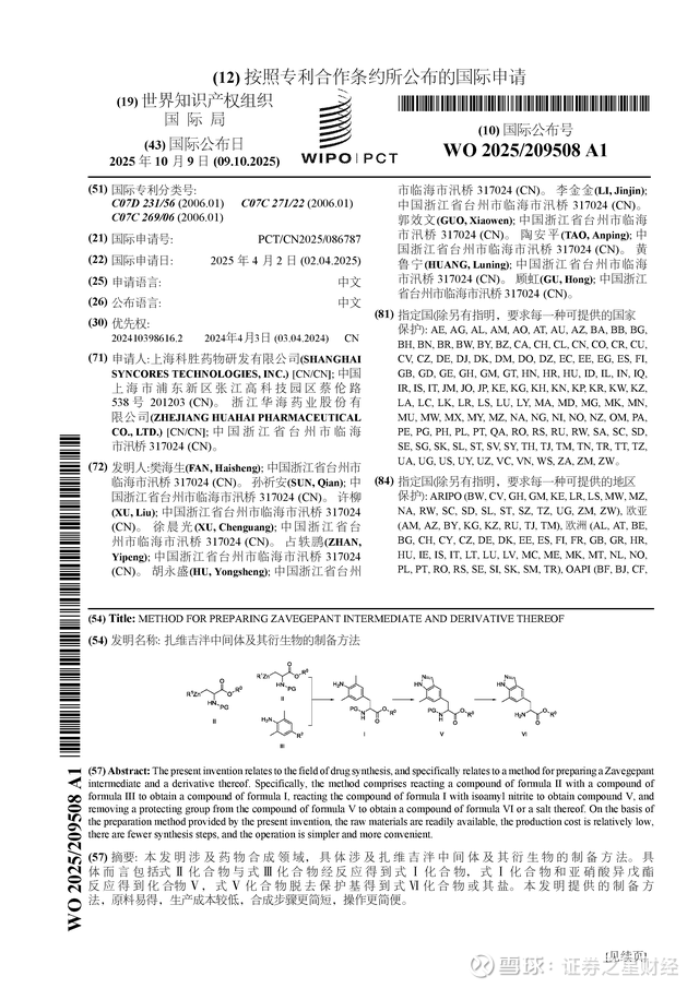 证券之星消息,根据企查查数据显示华海药业(600521)公布了一项国际专利申请,专利名为“扎维吉泮中间体及其衍生物的制备方法”,专利申请号为PCT/CN2025/086787,国际公布日为2025年10月9日。