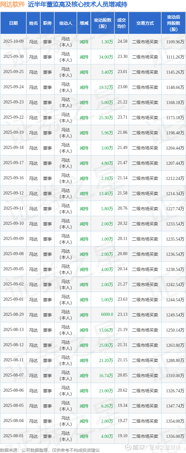 网达软件近半年内的董监高及核心技术人员增减持详情如下: