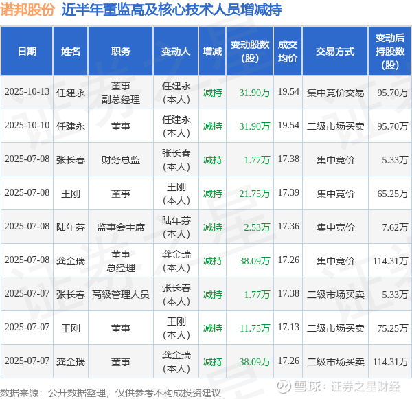 诺邦股份近半年内的董监高及核心技术人员增减持详情如下: