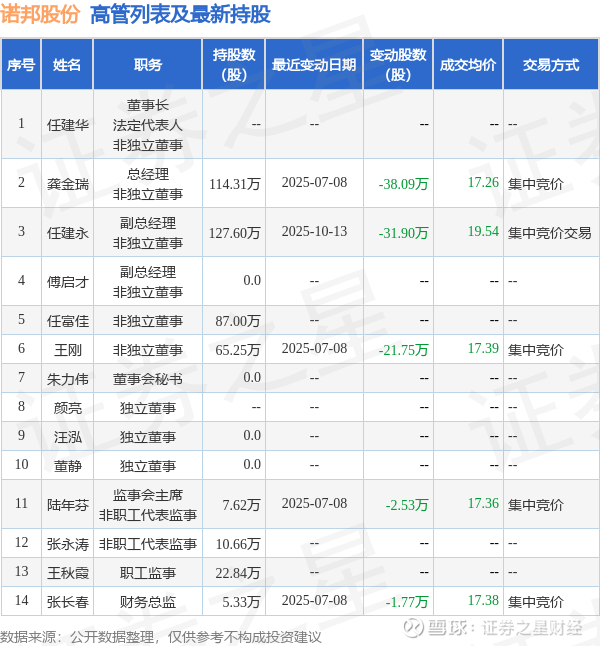 诺邦股份的高管列表及最新持股情况如下: