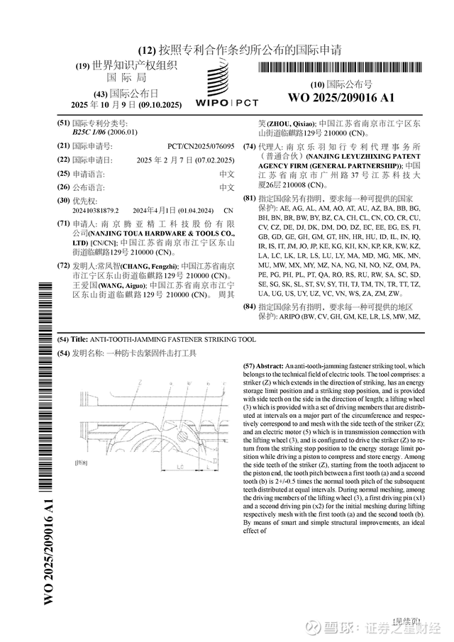 证券之星消息,根据企查查数据显示腾亚精工(301125)公布了一项国际专利申请,专利名为“一种防卡齿紧固件击打工具”,专利申请号为PCT/CN2025/076095,国际公布日为2025年10月9日。