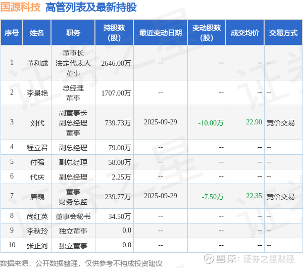 国源科技近半年内的董监高及核心技术人员增减持详情如下: