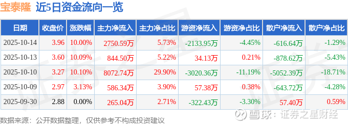 证券之星消息,宝泰隆10月14日涨停收盘,收盘价3.96元。该股于9点25分涨停,1次打开涨停,截止收盘封单资金为1.35亿元,占其流通市值1.77%。