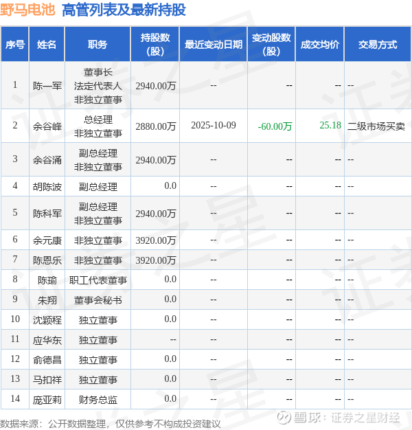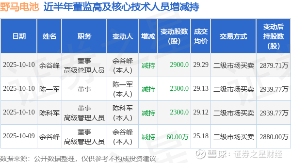 证券之星消息,根据10月14日市场公开信息、上市公司公告及交易所披露数据整理,野马电池(605378)最新董监高及相关人员股份变动情况:2025年10月10日公司董事陈一军、董事,高级管理人员余谷峰、董事,高级管理人员陈科军共减持公司股份7500.0股,占公司总股本为0.0029%。变动期间公司股价下跌1.82%,10月10日当日收盘报28.06元。
