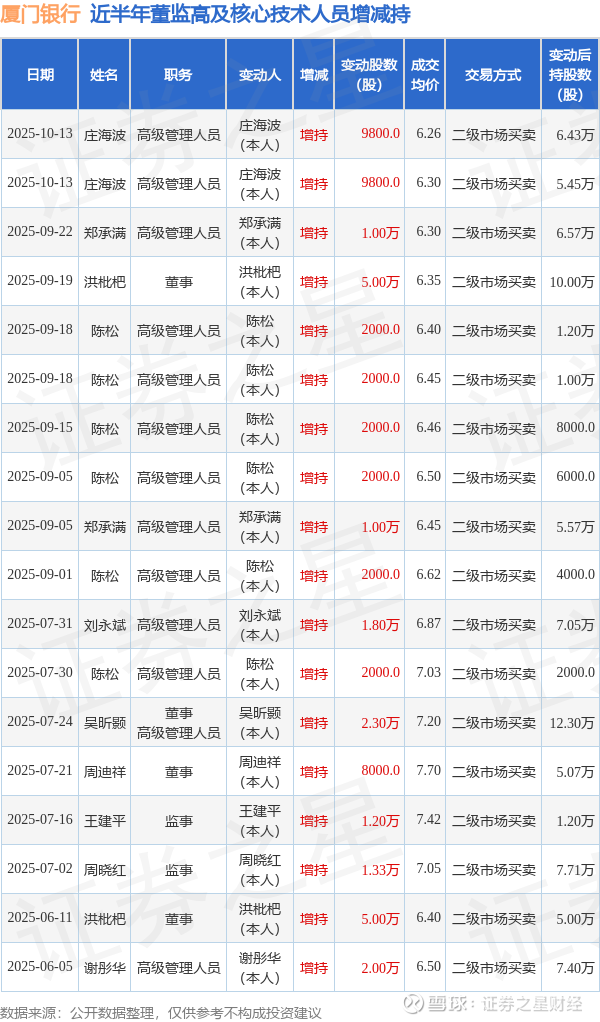 证券之星消息,根据10月14日市场公开信息、上市公司公告及交易所披露数据整理,厦门银行(601187)最新董监高及相关人员股份变动情况:2025年10月13日公司高级管理人员庄海波共增持公司股份1.96万股,占公司总股本为0.0008%。变动期间公司股价上涨1.42%,10月13日当日收盘报6.43元。