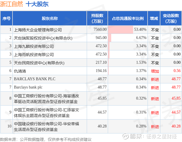 根据浙江自然2025年中报公布的十大股东详情如下: