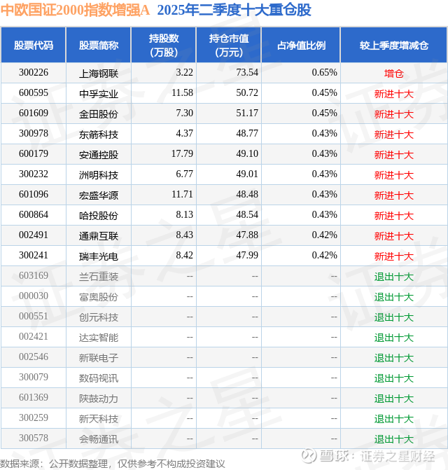 根据2025基金半年报公募基金重仓股数据,重仓该股的公募基金共1家,其中持有数量最多的公募基金为中欧基金的中欧国证2000指数增强A。中欧国证2000指数增强A目前规模为0.67亿元,最新净值1.3097(10月14日),较上一交易日下跌1.76%,近一年上涨45.06%。该公募基金现任基金经理为钱亚婷 宋婷。钱亚婷在任的基金产品包括:中欧互通精选混合A,管理时间为2021年11月3日至今,期间收益率为1.21%;中欧沪深300指数增强A,管理时间为2022年3月29日至今,期间收益率为16.45%;中欧中证500指数增强A,管理时间为2022年5月6日至今,期间收益率为36.64%;中欧小盘成长混合A,管理时间为2022年6月28日至今,期间收益率为57.05%。宋婷在任的基金产品包括:中欧中证500指数增强A,管理时间为2025年2月21日至今,期间收益率为33.27%;中欧金安量化混合A,管理时间为2025年4月2日至今,期间收益率为30.56%;中欧中证1000指数增强A,管理时间为2025年6月5日至今,期间收益率为25.73%;