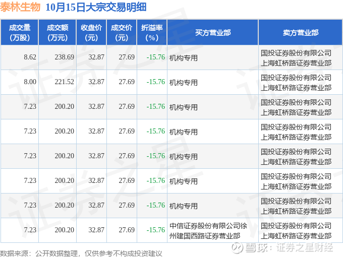 证券之星消息,10月15日泰林生物发生大宗交易,交易数据如下:
