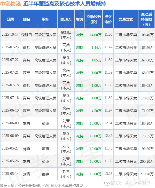 中创物流近半年内的董监高及核心技术人员增减持详情如下: