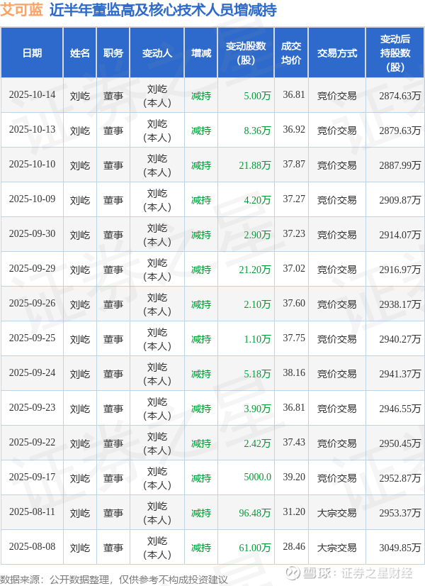 艾可蓝近半年内的董监高及核心技术人员增减持详情如下: