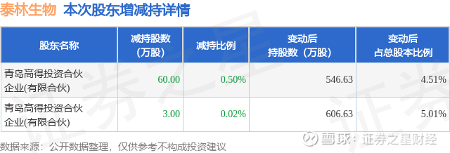 证券之星消息,10月16日泰林生物发布公告《泰林生物:关于持股5%以上股东暨控股股东、实际控制人的一致行动人减持股份结果公告》,其股东青岛高得投资合伙企业(有限合伙)于2025年9月18日至2025年10月15日间合计减持63.0万股,占公司目前总股本的0.5199%,变动期间该股股价下跌18.5%,截止10月15日收盘报32.87元。