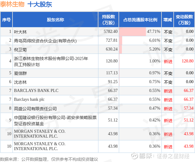 根据泰林生物2025年中报公布的十大股东详情如下: