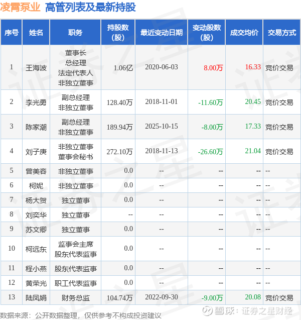凌霄泵业近半年内的董监高及核心技术人员增减持详情如下: