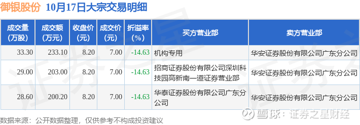 证券之星消息,10月17日御银股份发生大宗交易,交易数据如下: