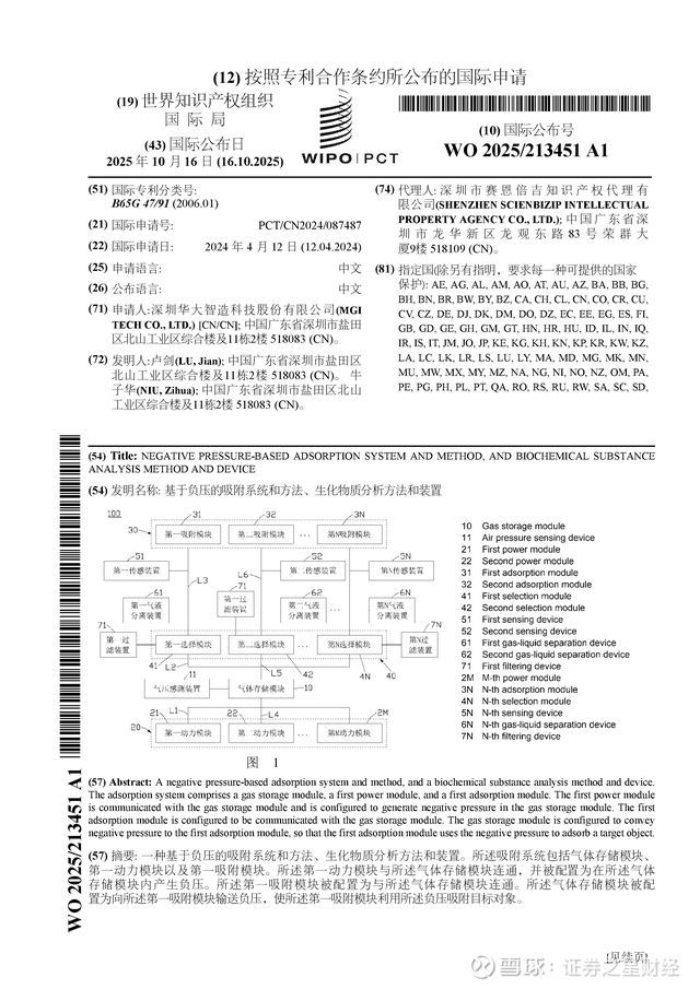 证券之星消息,根据企查查数据显示华大智造(688114)公布了一项国际专利申请,专利名为“基于负压的吸附系统和方法、生化物质分析方法和装置”,专利申请号为PCT/CN2024/087487,国际公布日为2025年10月16日。