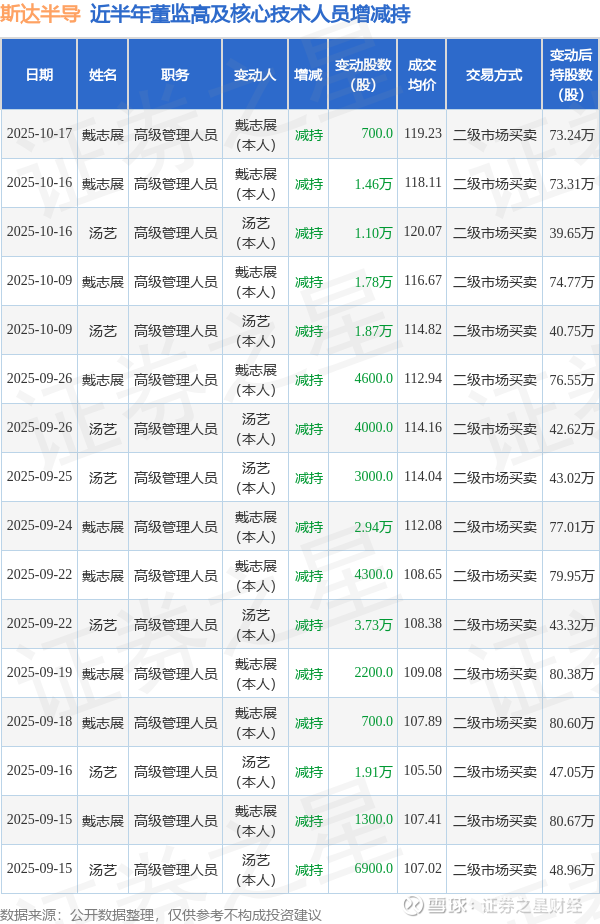 斯达半导近半年内的董监高及核心技术人员增减持详情如下: