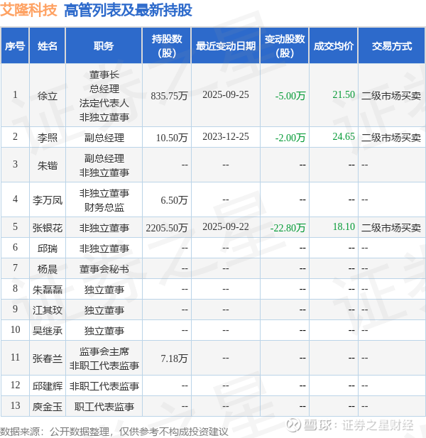 艾隆科技近半年内的董监高及核心技术人员增减持详情如下: