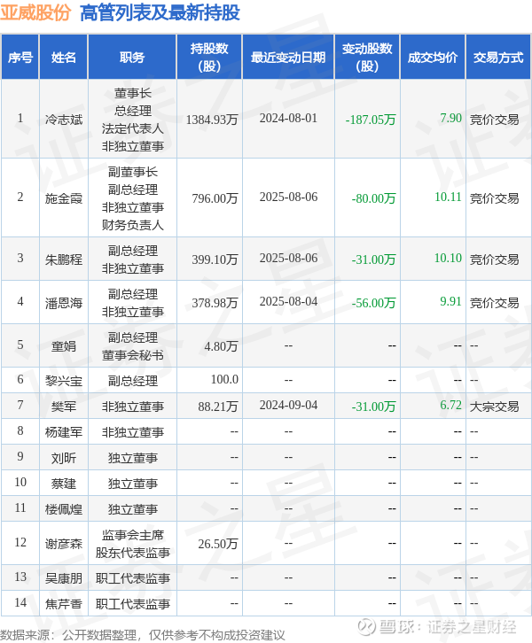 亚威股份近半年内的董监高及核心技术人员增减持详情如下: