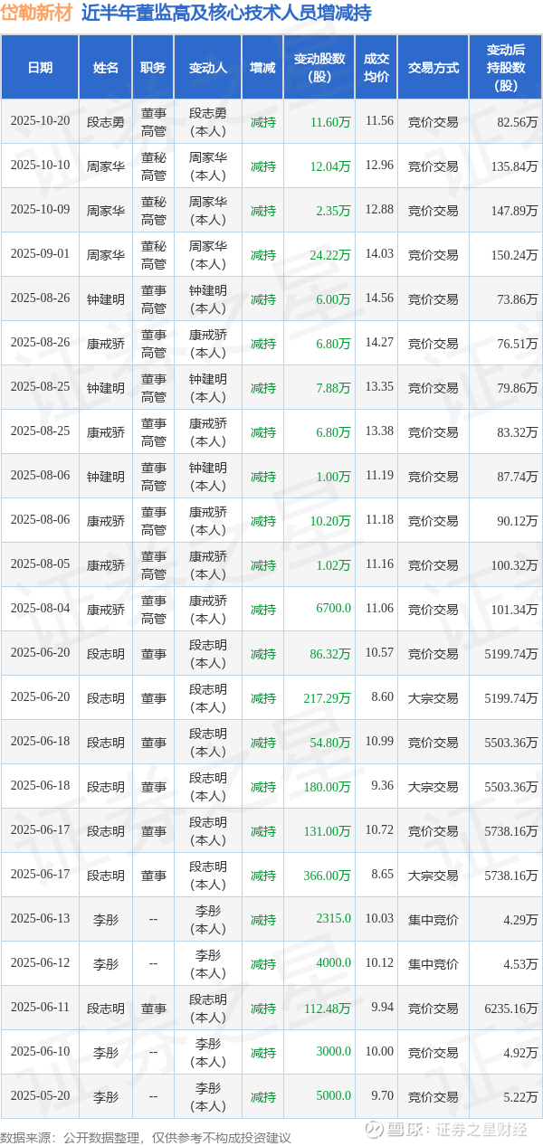 岱勒新材近半年内的董监高及核心技术人员增减持详情如下:
