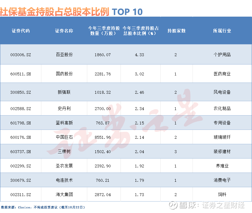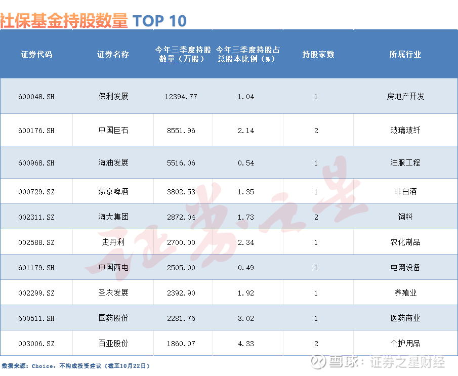据Choice数据,截至10月22日,已有近300家 A 股上市公司公布了 2025 年三季报,其中33家上市公司的前十大流通股东名单里出现了社保基金的身影。