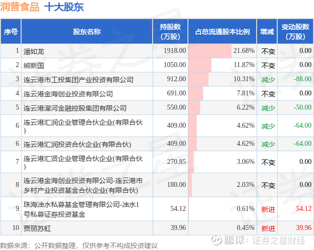 证券之星消息,10月22日润普食品发布公告《润普食品:持股5%以上股东权益变动达到1%的提示性公告》,其股东连云港金海创业投资有限公司于2025年9月5日至2025年10月22日间合计减持88.48万股,占公司目前总股本的1.0%,变动期间该股股价下跌24.61%,截止10月22日收盘报14.09元。