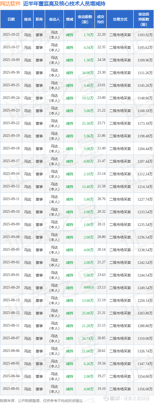网达软件近半年内的董监高及核心技术人员增减持详情如下: