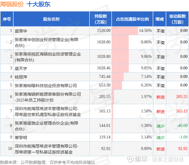 根据海锅股份2025年中报公布的十大股东详情如下: