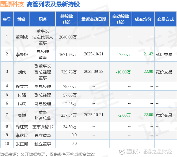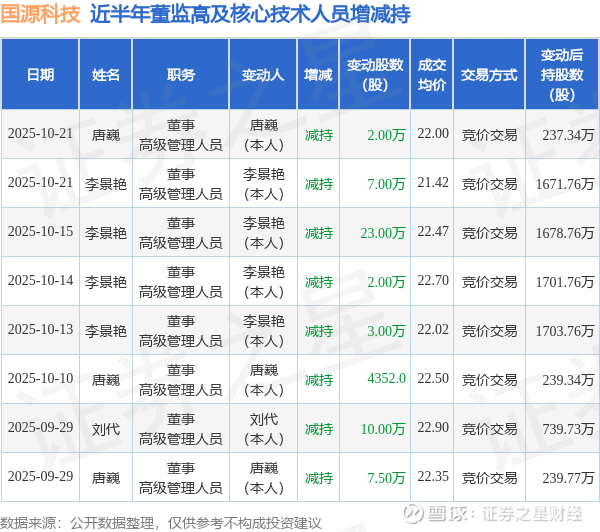 国源科技近半年内的董监高及核心技术人员增减持详情如下: