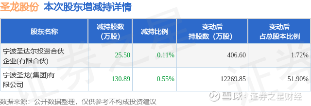 证券之星消息,10月24日圣龙股份发布公告《圣龙股份:圣龙股份关于控股股东及其一致行动人权益变动触及1%刻度的提示性公告》,其股东宁波圣龙(集团)有限公司、宁波圣达尔投资合伙企业(有限合伙)于2025年10月23日至2025年10月24日间合计减持156.39万股,占公司目前总股本的0.6615%,变动期间该股股价上涨11.88%,截止10月24日收盘报22.88元。