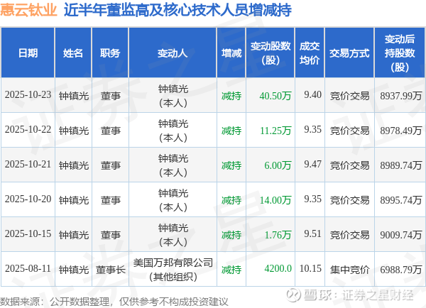 惠云钛业近半年内的董监高及核心技术人员增减持详情如下: