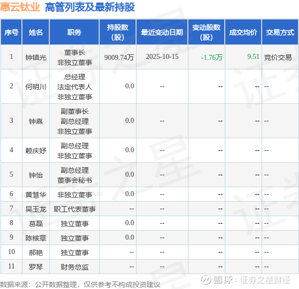 惠云钛业的高管列表及最新持股情况如下: