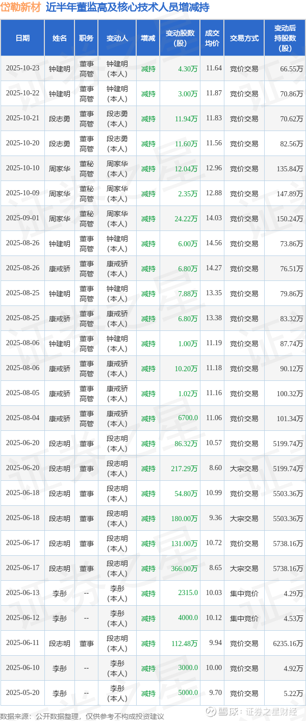 岱勒新材近半年内的董监高及核心技术人员增减持详情如下: