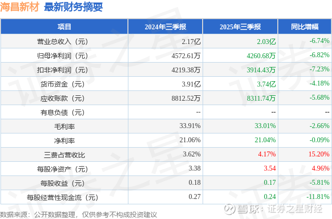 据证券之星公开数据整理,近期海昌新材(300885)发布2025年三季报。截至本报告期末,公司营业总收入2.03亿元,同比下降6.74%,归母净利润4260.68万元,同比下降6.82%。按单季度数据看,第三季度营业总收入6451.49万元,同比下降10.73%,第三季度归母净利润1186.45万元,同比下降21.04%。本报告期海昌新材公司应收账款体量较大,当期应收账款占最新年报归母净利润比达116.7%。