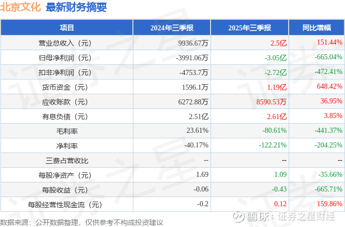 据证券之星公开数据整理,近期北京文化(000802)发布2025年三季报。根据财报显示,北京文化增收不增利。截至本报告期末,公司营业总收入2.5亿元,同比上升151.44%,归母净利润-3.05亿元,同比下降665.04%。按单季度数据看,第三季度营业总收入9208.62万元,同比上升0.48%,第三季度归母净利润-7269.81万元,同比下降915.56%。