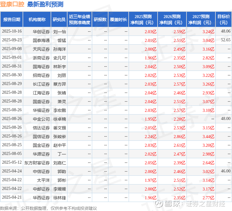 登康口腔(001328) 业绩简评 10 月 24 日, 公司披露 2025 年三季度报告, 3Q25 收入 3.86 亿元,同比+10.49%; 归母净利 0.51 亿元, 同比+11.43%; 净利率 13.13%,同比+0.11pct。 经营分析 3Q 医研系列大单品迭代放量, 线下增长相对稳健,线上主动优化渠道投放。 冷酸灵“医研 7 天” 系列持续放量, 焕色美白/重组蛋白等新品迭代, 9 月重组蛋白抖音销额 489 万, 单品排名第一。 分区域看, 预计线下基本盘仍能超越行业表现,实现一定增长; 根据久谦数据, 3Q 牙膏品类中冷酸灵线上 GMV1.1 亿元,同比+14.1%,分平台看,天猫京东增长相对强势, 猫东抖分别 0.53/0.21/0.36 亿元,同比+60%/+97%/-32%,预计主因公司主动优化渠道投放, 阶段性减少抖音的费用投入;其中 7 月/8 月/9 月分别线上 GMV0.28/0.41/0.42 亿元,同比-1.6%/+23.2%/+17.8%。 毛利率短期承压,费用管控优异,整体盈利表现有所改善。 毛利率短期承压,费用管控优异,整体盈利表现有所改善。 25Q1-3 毛利率 50.50%,同比+1.24pct;其中 Q3 毛利率 45.9%,同比-8.03pct,毛利短期承压,预计主因促销力度加大单价降低。 25Q1-3 公司销售/管理/研发/财务费用率分别为 33.04%/3.82%/3.27%/- 0.66%,分别同比+1.77/-0.37/-0.37/+0.10pct;其中 Q3 分别为 25.51%/4.76%/3.73%/-0.68%,同比-8.00/+0.38/-0.07/-0.15pct。综合影响下, 2025Q1-3 公司净利率为 11.06%,同比-0.14pct; 2025Q3 单季净利率 13.13%,同比+0.11pct,环比+2.92pct,预计主要受益于主动的渠道费用投放策略调整。 短期看依托大单品驱动份额提升逻辑清晰,中长期布局口腔医疗与美容护理类打造新曲线。 公司作为抗敏感细分龙头(市占率超60%),短期看, 依托爆品驱动&线下渠道深耕, 高端产品推动盈利结构优化,份额提升逻辑有望加速兑现, 营销端不断优化,积极推动年轻化转型(签约吴磊、 合作《快乐向前冲》 等);中长期依托研发积淀及渠道基础,积极向口腔医疗、 美容护理等高潜力领域延伸,有望打开第二增长曲线。 盈利预测、估值与评级 预计公司 25-27 年归母净利分别为 1.9、 2.3、 2.8 亿元,当前股价对应 PE 分别为 40、 33、 28X, 维持“买入”评级。 风险提示 市场竞争风险; 新品放量不及预期风险。